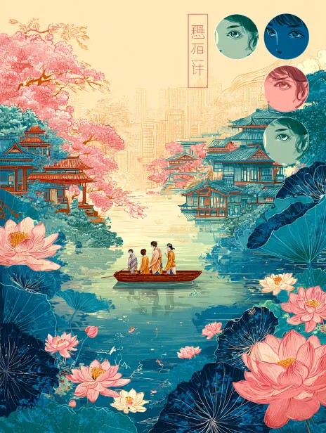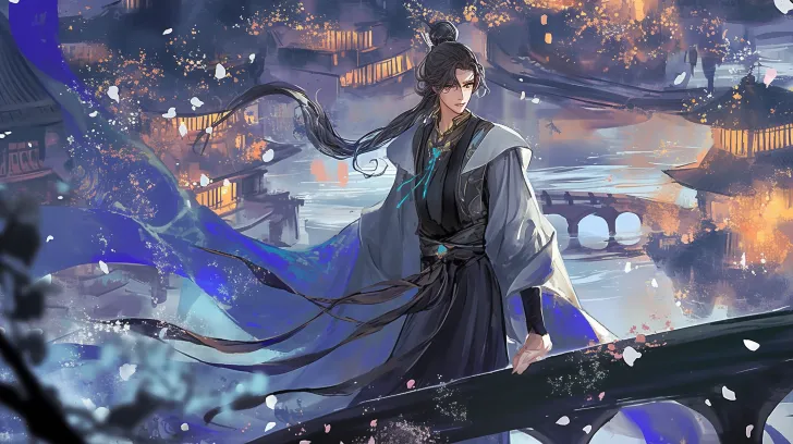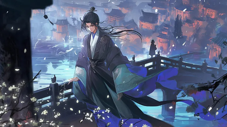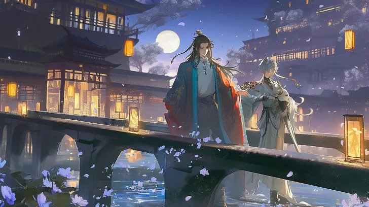 https://images.gogpt.vip/aigf/m_origin/20260221/1131737/67qxuerriej1n5ti.jpg https://images.gogpt.vip/aigf/m_origin/20260221/1131737/235oh9znwlsal6j0.jpg https://images.gogpt.vip/aigf/m_origin/20260221/1131737/vits3y5obaagbm6i.jpg https://images.gogpt.vip/aigf/m_origin/20260221/1131737/88ngos4r2yzunnaf.jpg Ancient style illustration, horizontal insert, night colors, night blue color tone, close-up of a bridge, a boy walking on the bridge, ancient buildings in the distance, brightly lit, the boy with a gentle smile, water rippling under the bridge, wind gently lifting his clothing, eye-level composition, background with ancient passersby, fluttering clothes and hair, overall picture dreamlike and hazy, soft light and shadow transitions, exquisite details without blur, glass-like texture and clear clothing texture, fitting the style and tone. --ar 16:9 --stylize 100 --iw 2 --niji 6