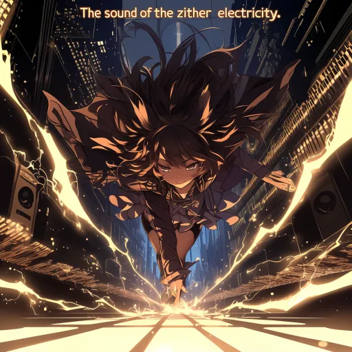 Large English artistic text: "The sound of the zither triggers the electricity." Things described: a street made of piano keys, lightning, guitar strings, single-point perspective, distance, sense of speed. Generate a two-dimensional anime-style human girl character, then add the characteristics of the things described above to the character. Subsequently, randomly generate matching character actions, character clothing, scenes, backgrounds, lighting, and composition based on the characteristics of the things described above and the generated character. --ar 1:1 --stylize 100 --niji 6 --no Low resolution,blurry,distorted,twisted,overexposed,low quality,repeated limbs,cluttered composition,extra hands,extra feet,proportion errors,anatomical errors,noise,water,exaggerated expressions,unnatural lighting and shadows,watermark,realistic art style,real person,reality.
