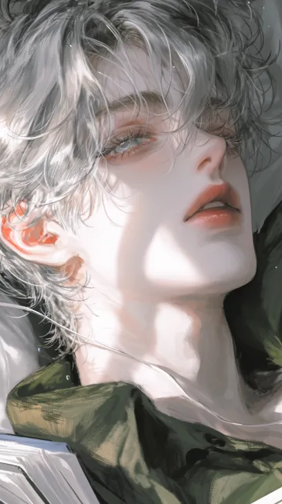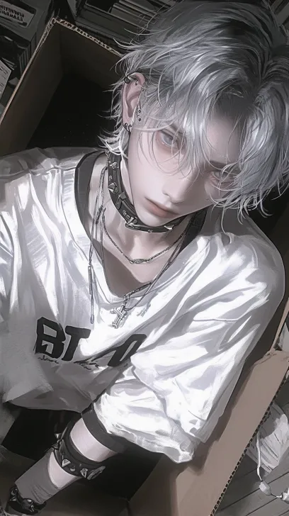 A handsome male is curled up lying on his side in a huge brown cardboard box, captured in a 9:16 vertical close-up. He has fluffy white hair of medium length, with delicate and glossy strands. His eyes are clear and bright sapphire blue, with a naive and curious gaze, looking directly at the camera. His physique is extremely robust, with well-defined muscle lines, but his skin is slightly cool-toned and fair. **He wears a simple white mechanical collar around his neck, made of smooth material, with a row of tiny blue LED lights evenly spaced along the collar, emitting a soft and steady breathing light.** He is loosely wrapped in clean white bandages, which are wrapped very casually, with numerous strips of bandage already loosened, sliding off and scattered inside the box and on his body. The interior of the box reveals a wrinkled cardboard texture, with scattered bits of bandage inside as well. Warm morning light streams in diagonally from the side window, illuminating his collar and skin, highlighting the dust particles in the air, creating a soft halo and lens flare. The background features a softly blurred warm-toned wooden floor. Style: top-tier game CG character illustration, a blend of science fiction and art, thick paint style, oil painting texture, visible brush strokes, ultra-high-definition details for skin texture, collar metal/plastic texture, bandage fibers, etc., with an extremely delicate facial expression, combining realism with artistic sense, master-level illustration. 8k --ar 9:16 --stylize 250 --niji 6 --sref https://images.gogpt.vip/aigf/m_origin/20260112/2016197/pfgmtqswzfoc8ft1.jpg --cref https://images.gogpt.vip/aigf/m_origin/20260112/2016197/pfgmtqswzfoc8ft1.jpg --cw 20 --sw 147