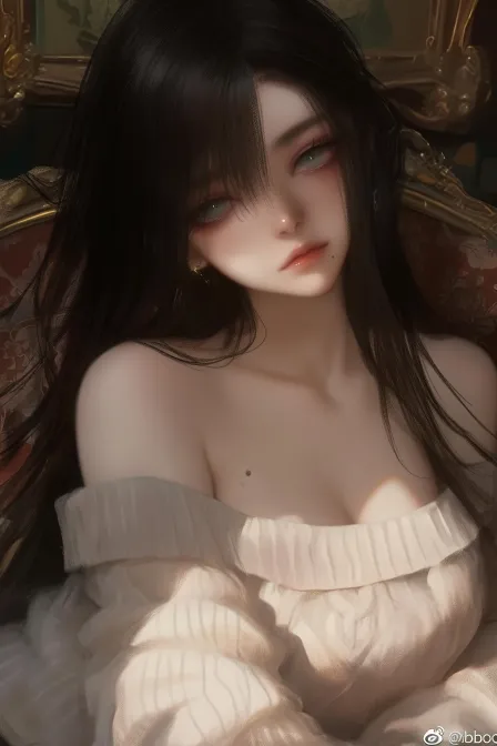 https://images.gogpt.vip/aigf/m_origin/20260112/2024065/r7zejt2akxcoo20c.jpg Young woman, but with mature temperament, plump body shape, black long straight hair, painting style reference cushion picture, pupil color light blue-green, slightly rich lower eyelashes, a pale mole on the left chest, light color, pale expression, wearing off the shoulder sweater, chest mole is more obvious, lip color light and low saturation, style fusion, specific reference cushion picture, background should blend in with the character, indoor, requires a small overhead angle, giving a warm and comfortable feeling. Her long hair draped over her shoulders, with black strands contrasting with the background, showcasing a delicate texture. The decoration with dark tones in the background creates a mysterious and elegant atmosphere. The overall picture adopts soft lighting, highlighting gentle emotions and atmosphere --ar 2:3 --stylize 100 --iw 1.25 --niji 6 --no Hand