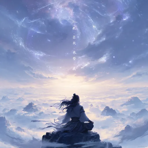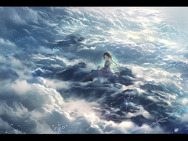 https://images.gogpt.vip/aigf/m_origin/20260119/2032000/c0x91tw7xslt7wjc.jpg Movie shot, wide-angle perspective, cloud sea immortal atmosphere. The character in the picture is a cultivator who suddenly realized with closed eyes, creating a fairy like atmosphere surrounded by clouds and mist. She sits cross legged on the top of the mountains, her clothes fluttering, and behind her is a faintly visible sect flying eaves. The side light penetrates the clouds to illuminate her body, surrounded by light blue spiritual stars and subtle runes, with fine details, 8k --ar 4:3 --stylize 100 --iw 0.25 --niji 7