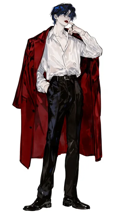 A boy with blue-black hair and a silver ring. Full body illustration, front view, standing posture, cool and handsome, rebellious and stylish. He is wearing a white shirt and suit, with a long red coat draped over it, black straight-leg trousers, black leather shoes, cold white skin, watery skin texture, moist glass-like lips, blue, standing posture. The work features soft brush strokes and delicate lines. It also incorporates elements of anime aesthetics and comic style, with a solid color background. --ar 9:16 --stylize 100 --niji 7 --no Text,letters,watermark,tattoo.