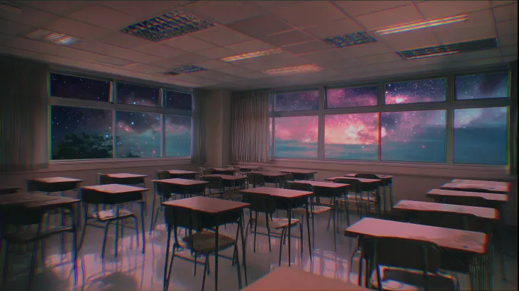 Threshold space, an empty classroom at dusk, desks and chairs neatly arranged, but one wall dissolves into a nebula, soft VHS filter, color shift, matte colors, nostalgia and unease, wide-angle lens. --ar 16:9 --v 7 --stylize 100