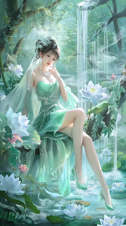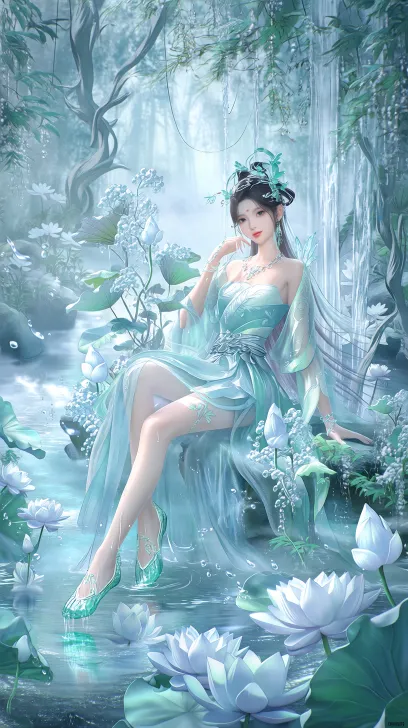 National Style Elements · Soft and Enchanting Fairy (8K Mist Light Texture): Shoulderless silk Hanfu, fair and tender skin, icy and jade bones, imperial sister, surrealism, real-life model, melon seed face, Liu Yifei's appearance, Hanfu, strapless skirt, surrealism, lips dyed with water red and slightly lifted, Ding Dal, feet stepping on emerald crystal shoes soaked in shallow streams; Sitting on flowers, trees, and vines, the water vapor and smoke create a fairyland on earth. The veil hangs down to cover the half exposed jade legs, and white lotus floats on the stream. The misty forest is wrapped in broken light, and every line is charming and alluring. 16K quality, --ar 9:16 --stylize 100 --niji 7 --no Deformed face,deformed fingers,low resolution,dim image.