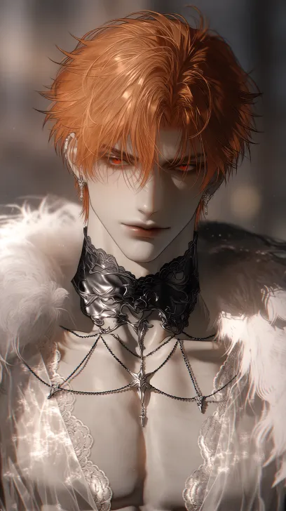 Realistic anime style, OC renderer, matte texture, hazy feeling, handsome adult man, strong, orange hair, red eyes, white skin, blurred background, close-up shot of the face, headshot, atmosphere, disdainful contempt, gothic sheer clothing, lace trim decoration, necklace, white fur collar, open collar. --ar 9:16 --niji 7