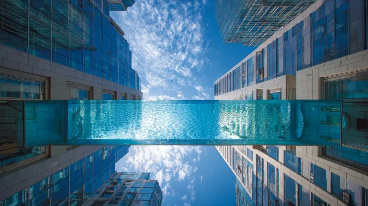 Above modern skyscrapers, there is a suspended swimming pool, its transparent surface beautifully reflecting the blue sky. --ar 16:9 --v 7 --style raw --stylize 100