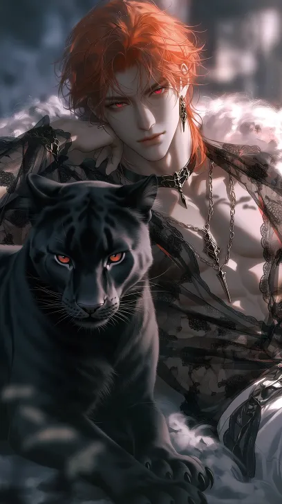 Semi realistic style, OC renderer, matte texture, hazy feeling, handsome adult man, strong, orange hair, red eyes, white skin, blurry background, atmosphere, contempt and disdain, Gothic style chiffon, lace decoration, necklace, white fur collar, open neckline, lying on the side, chiffon, with a red eyed black panther standing in front of him, wearing a collar around the panther's neck, high recognition rate, high definition, high image quality --ar 9:16 --niji 7