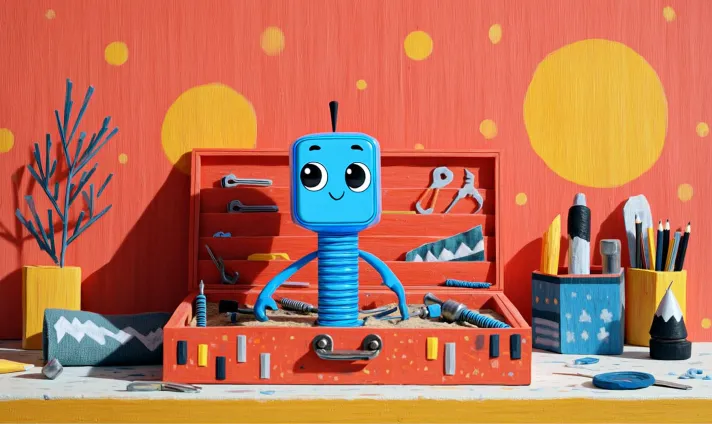 Scene description: A sunny morning, the interior of a brightly colored toolbox, sunlight filtering through the gaps to create warm yellow spots. Main character: Little Screw Drew, with a tiny metallic body glimmering softly, curiously surveying the surroundings. Expression and action: Drew's round eyes wide open, head slightly tilted, innocently curious. Background details: Inside the toolbox, neatly arranged are tools like pencils, saws, and electric drills, with soft cloth in the corner and faint signs of use on the tool belt. Tone and atmosphere: Warm and bright warm yellow tones, cozy and safe. Perspective and composition: Low-angle eye level, emphasizing Drew's small size and immersing into his perspective. --ar 5:3 --v 7 --style raw --c 5 --stylize 95 --sref https://images.gogpt.vip/aigf/m_origin/20260120/863870/xwyyolx2pc7na3r3.jpeg --oref https://images.gogpt.vip/aigf/m_origin/20260120/863870/sp30604cyubke815.png --ow 88 --sw 98
