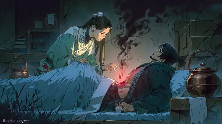 https://images.gogpt.vip/aigf/m_origin/20260121/2034336/vpn3pasjns1bbizl.webp Generate image: Naming options: "Jiangzhu" (referred to as "Hongwan" in Chinese) Core plot: Kong Sheng suffers from malignant sores, and Jiaona spits out Hongwan to heal him. Kong Sheng forgot the pain as he gazed at Jiaona, and his feelings were deeply rooted. Character and Action: Character 1: Jiaona, sitting on the edge of the bed, lightly pressing Kong Sheng's shoulder and arm with her left hand to stabilize, with her right palm facing upwards, holding the red pill and moving it above the sore. Slightly lean forward with a graceful neck curve. Dressed in a water green cross collar skirt, the cuffs are tightly tied, the collar is embroidered with intertwined vine patterns, and the hair is tied up with a simple white jade hairpin. Character 2: Kong Sheng, half lying down, looking up at Jiaona, unconsciously clenched the mattress under his left hand. The chest of the body is exposed, and the muscles at the sore area are newly formed, with a pink color. The clothing was not worn on the upper body, only covered with a faded blue thin quilt. Environmental composition: The study room of the Huangfu family is simple and elegant. There are bookshelves, medicine stoves, and copper pots (filled with water and white cloth). Key details: The "disease qi" dispelled from the sore has turned into a few strands of dissipating black gray light smoke, and Jiaona's sachet and surgical tool set hanging around her waist. The only main light source is the red pill, emitting a soft and bright vermilion light that illuminates Jiaona's focused face, her hands, and Kong Sheng's chest from bottom to top, creating a strong contrast of light and dark (Rembrandt effect), and the surrounding environment sinks into shadows. Screen color tone: The red pill light source area is vermilion, meat powder, and warm white; The shaded area is dark green, dark brown, and dark purple. The overall atmosphere is sacred and secretive. The painting style is a combination of ink and fine brushwork with digital board drawing effects, and the composition has a strong sense of photography and perspective. High resolution, --ar 16:9 --stylize 262 --niji 7