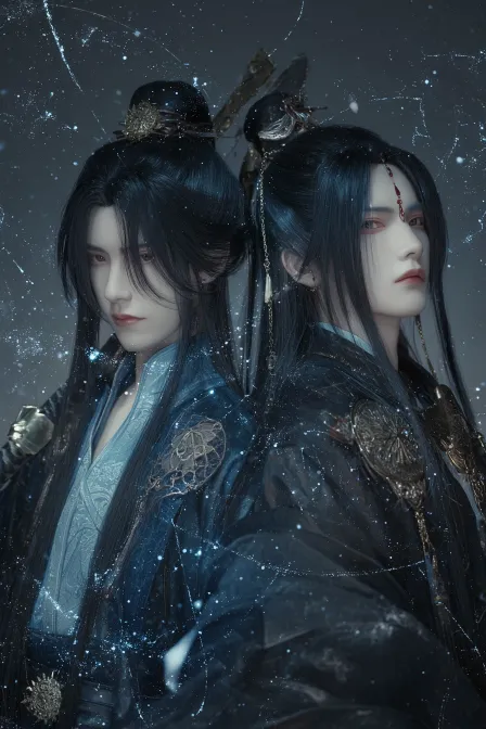 https://images.gogpt.vip/aigf/m_origin/20260121/2034439/twztowhwlx7ebc00.jpg Generate a pair of twin male twins from ancient China, with long black hair, complex hair accessories, sword eyebrows and star eyes, blue and black clothing, one person holding a star compass and the other holding a sword, and a background of a dark night sky star map. The camera ensures that the waist of the two can be seen, and the overall filter is dark, creating a oppressive atmosphere. Guomo, best quality, ultra high definition, ultra fine, --ar 2:3 --v 7 --stylize 100 --iw 0.25