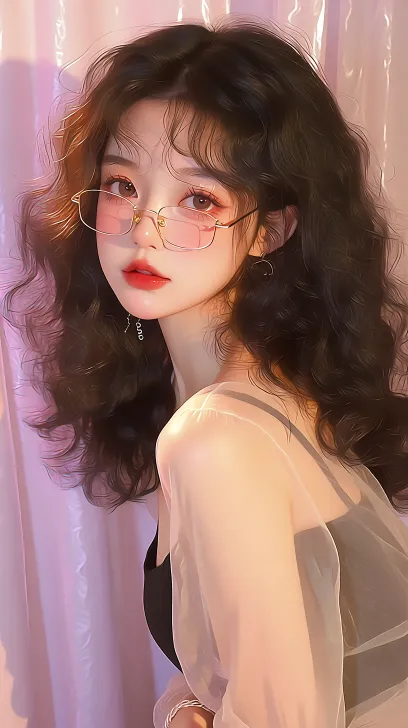 Hyper-realistic digital illustration, featuring a cool and gentle East Asian girl, wearing thin-framed gold wire glasses, with fluffy deep brown-black wavy hair cascading naturally, the strands exhibiting a soft sheen. Her makeup consists of light pink blush paired with a translucent red-toned lip look, and the eyes are adorned with a hint of reddish-brown eyeshadow, giving her a lazy and dreamy gaze. She is dressed in a semi-transparent light beige off-shoulder loose top, layered over a black strapless piece, with a delicate white bracelet on her wrist. The background features soft semi-transparent fabric with a hazy pink-purple gradient, and the overall lighting is warm and softly diffused, with a delicate bokeh effect. The image is intricate and transparent, creating a fully immersive atmosphere. Keywords: delicate brushwork, soft light and shadow, translucent texture, dreamy atmosphere, youthful vibe, exquisite makeup, fluffy curly hair, light-colored outfit Style and detail breakdown: - Makeup: This follows a clear and atmospheric route, with the blush and lip color harmonizing in red tones, while the eyeshadow provides only slight color accents, highlighting a gentle yet slightly distant temperament. - Hairstyle: The fluffy large wavy curls are key to creating a lazy feel; the deep brown-black hair reflects a natural sheen under soft lighting, giving it an airy and layered appearance. - Clothing: The semi-transparent light beige top paired with the black layering piece maintains a sense of gentleness while adding a touch of sensuality through the off-shoulder and semi-transparent design, perfectly balancing the overall cool temperament. - Lighting and background: The diffused warm light makes the skin appear delicate and transparent, while the semi-transparent fabric and gradient tones in the background further enhance the dreamy and gentle atmosphere of the artwork. --ar 9:16 --stylize 100 --niji 7