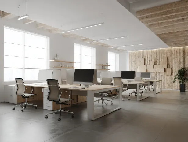 https://images.gogpt.vip/aigf/m_origin/20260121/2034529/p8qcp1mei0ci584e.png Modern office environment, designed with simplicity and strong functionality. There are multiple office desks in the space, equipped with comfortable chairs, and computer monitors placed on the desktop. The wall adopts light tones, and bright natural light shines into the room through the large windows, creating an open and bright atmosphere. There are wooden decorations on the background wall, adding a touch of warmth. The overall spatial layout is reasonable, giving people a clean and professional impression. Ultra fine, ultra realistic, 16K quality, 3D rendering, 3D models, documentary photography, ultra high definition, complex details, --ar 4:3 --v 7 --stylize 100 --iw 1.25