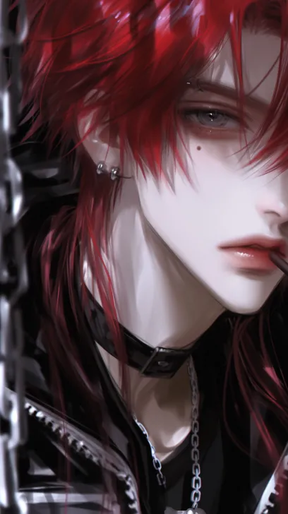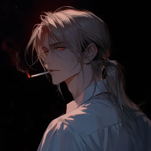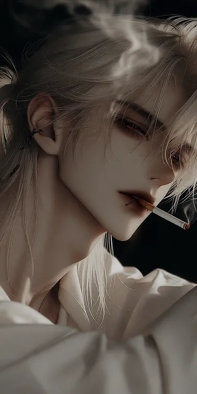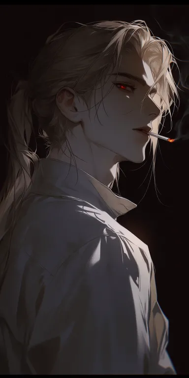https://images.gogpt.vip/aigf/m_origin/20260121/2034513/gvtmwz3x0jzafmud.jpg Red pupils. An adult man faces the camera sideways, his fair long hair tied into a neat ponytail, with a few strands of broken hair hanging down beside his jawline. He held a cigarette between his lips, with the cigarette butt flickering faintly. His white shirt was loosely pressed against his shoulders and neck, outlining smooth lines. His delicate side profile was sharply defined in the dim light, and his red eyes shimmered with a cold light in the shadows, exuding a lazy and distant aura. --ar 1:2 --stylize 100 --iw 0.25 --niji 7