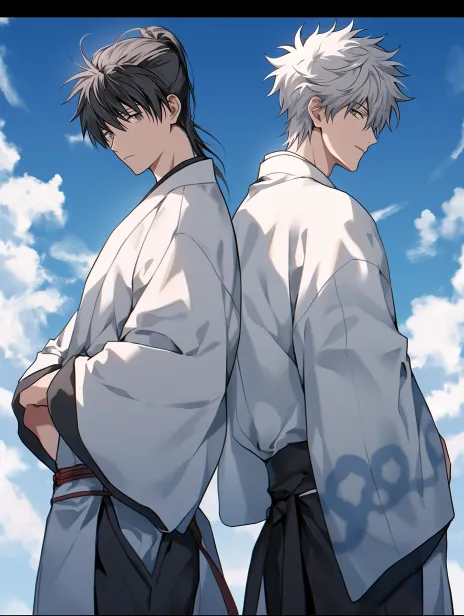 Gintama characters, Sakata Gintoki, Hijikata Toshiro, Hijikata Toshiro has a high ponytail that is tugged by Sakata Gintoki, the angle should be from the side showing half of the face and above the waist, the background should be warm with blue sky and white clouds, clamp art style. --ar 3:4 --stylize 100 --niji 5