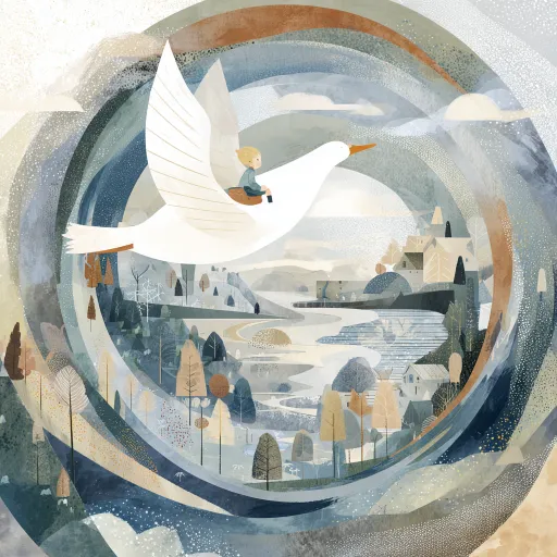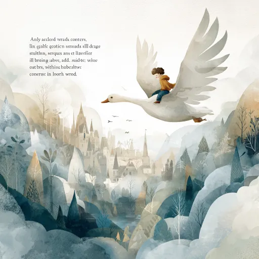 Hand drawn watercolor style illustration, used as the book cover for the novel "Nils' Goose Riding Journey". 32 Kaifeng surface size. The content of the picture is mainly about a little boy riding a white goose in the sky, passing through towns, forests, lakes, etc. based on Sweden. The overall style is fresh and bright, using soft, low saturation warm gray, light blue, beige, and light green colors. The overall temperature is slightly higher than nature, but still restrained and quiet. Require the little boy to ride a white goose vividly and vividly. The white goose is in a soaring state. Long term vision. Do not include text. --ar 1:1 --v 7 --stylize 100