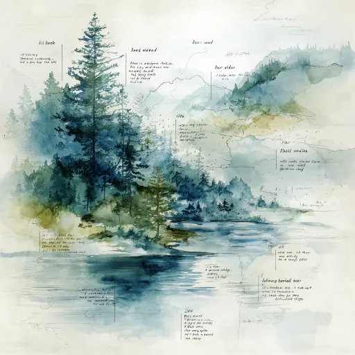 Hand-painted watercolor style abstract nature journey illustration. The image depicts a "lake and forest" theme, but does not feature clear landmarks or realistic scenes. Using low-saturation blue-green, gray-green, and misty colors, the overall tone is soft and restrained. The image only hints at natural elements: · Color blocks and ripples on the lake surface · Outlines and layers of pine forests and tree shadows · Strokes of mist, wind lines, and water vapor No specific tree species are depicted, no clear leaves are illustrated, no realistic reflections are shown, and no real buildings are painted. The brushwork is loose, edges softened, with obvious watercolor blurring, white space, and paper texture. Overall, it resembles a "background page of a fairy tale picture book where the story has yet to unfold," leaving plenty of room for imagination and suitable for collage with other map sections. The image is quiet, gentle, and hazy, avoiding dramatic lighting, strong contrasts, and realistic details. Qualitative keywords: journey, quiet, waiting, breath of nature. --ar 1:1 --v 7 --stylize 100
