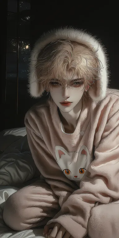The night seeped into the gaps of the bedroom, immersing the entire space in a thick darkness. Only a wisp of moonlight seeped in from outside the window, casting small specks of light along the edge of the bed, trapping everything around in a hazy shadow. The boy knelt in the center of the soft mattress, with a frontal view becoming the only focal point in the dark tone, so captivating that it was impossible to look away. His posture was well behaved and quiet, kneeling with his knees together, his hands gently resting on the bed between his knees, his forearm naturally resting on the edge of the bed, his fingertips interlocked, perfectly fitting the kneeling figure, his movements relaxed and natural, with a hint of silent restraint. The young man's appearance is exquisite and handsome, with light yellow short hair that is neat and refreshing, reaching the tip of the ear in length. The hair is fluffy and covers the forehead and temples, mixed with a few strands of light brown and milky white mixed hair, shining with a delicate luster in the dim light, adding a dynamic layer to the single hair color. He was wearing a pink plush hat that was integrated with his pajamas. The thick brim of the hat was adorned with a circle of soft short hairs, gently pressing against the sides of his cheeks, making his jawline even softer. His fair skin had a faint porcelain feel in the dark night. The pink furry pajamas on the body are loose and comfortable, with a wide but not bulky design, perfectly outlining the thin shoulder line of the teenager, and the fuzzy texture on the surface of the fabric is clearly visible. In the center of the pajamas was printed a round white kitten pattern, with amber round eyes and a shallow smile at the corner of its mouth. The pink and white color scheme exuded a naive childlike innocence, but formed a sharp contrast with the emotions in the boy's eyes- his brown pupils were shrouded in a thin mist, shrouded in an indescribable melancholy, his eyes drooped slightly, his eyelashes were long and thick, and he cast a shallow shadow under his eyes in the blink of an eye. The melancholy hidden in his eyes gave his handsome features a touch of broken tenderness. The fluffy brim of the nightgown gently covered his earlobes, revealing only the small earlobes. The slender and elongated neck line, along with the loose collar, faintly revealed the delicate collarbone, casting a faint shadow in the dim light and shadow. His lips were lightly pursed, with a natural pale pink color that blended with his pink pajamas, but accentuated his expression of desolation. The position of overlapping hands is firmly supported on the bed between the knees, with slender and elongated fingers, clean and round trimmed nails, and a faint pink blush on the fingertips. The knuckles curl slightly, as if subconsciously trying to grab something, adding a subtle sense of discomfort to the quiet posture. The background is a blurry bedroom scene, and the dark tones make everything lose its clear outline, leaving only soft layers of light and shadow. On the pillow at the head of the bed, there were several soft little dolls, including a drooping eared rabbit with long ears, a round brown teddy bear, and a stuffed cat holding a carrot. They were wrapped in shadows, only faintly revealing their soft contours, quietly nestled behind the boy, like silent companions. The wardrobe at the back of the bed is half closed, and the clothes hanging on the hangers blend into the dark night, leaving only blurry color blocks. The floor lamp in the corner of the wall hangs a fabric lampshade, creating a soft transition between the warm contours and the dark background, further enhancing the tranquility of the bedroom. The plush texture of pink pajamas is rendered layer by layer with varying shades of brushstrokes, and each strand of fluff is three-dimensional and realistic; The young man's hair is clearly defined, with natural transitions between light and dark. The details of the mixed hair are also vividly depicted; The texture of the skin is transparent and delicate, with light and shadow forming a soft gradient on the cheeks, neck, and back of the hand, exuding a natural texture. The dark background is laid out with low saturation color blocks, and the blurry bedroom elements not only do not grab the spotlight, but also create a peaceful atmosphere, making the kneeling teenager the absolute core. His kneeling posture, crossed hands between his knees, hazy and melancholic gaze interweave with his cute pink plush pajamas and cozy bedroom dolls, blending handsomeness and fragility to create a highly narrative scene, like a gentle beam of light in the dark night, making people unable to resist the urge to approach and understand the thoughts hidden in his eyes. He is a man. --ar 1:2 --stylize 100 --niji 7 --sref https://images.gogpt.vip/aigf/m_origin/20260121/2034513/srymuq3vbi9nihkl.jpg --sw 241