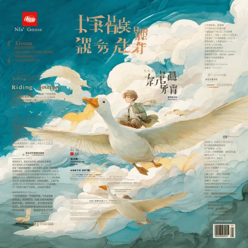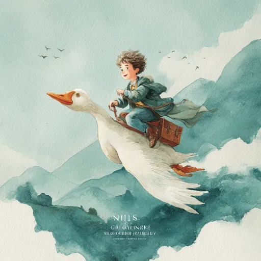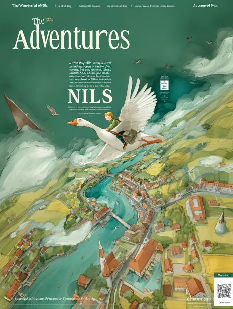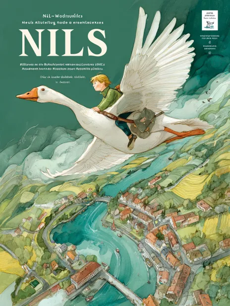 Hand-painted watercolor style illustration, as the book cover for the novel "The Wonderful Adventures of Nils." Size of 32 open cover. The image content mainly features "a little boy riding a white goose flying in the sky, passing by towns, forests, lakes, etc., modeled after Sweden." The overall style is fresh and bright, with a color scheme primarily of green, white, etc. The depiction of the little boy riding the white goose should be vivid and lifelike. The white goose should be in a soaring state. Distant view. --ar 3:4 --v 7 --stylize 100 --zoom 2