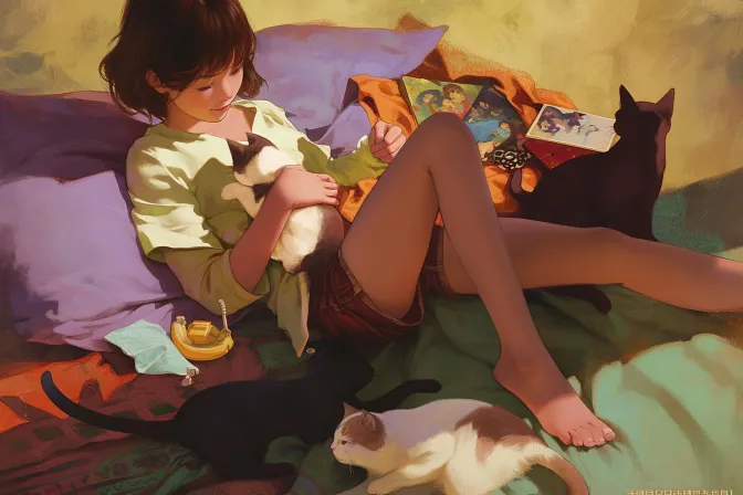 https://images.gogpt.vip/aigf/m_origin/20260120/6846/wouoxiqcgyc90u3g.jpeg A young girl is sitting on a soft cushion, surrounded by several cute cats. She was wearing a loose T-shirt and shorts, holding a cat in her hand while the other cat lazily snuggled up on her lap. The background color is rich, with patterns of purple, green and other colors on the mat, creating a comfortable and warm atmosphere. There are also some toys and magazines next to it, and the overall picture is full of life atmosphere, expressing the joy of intimate interaction with animals. --ar 3:2 --style raw --stylize 100 --iw 0.25 --niji 6