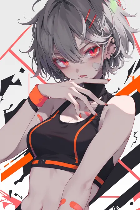 Young female character, short gray hair, eyes in red, with delicate makeup, wearing a black sports outfit that exposes part of her abdomen, with orange stripes on the clothing. Her fingers are gently resting on her chin, with a confident and slightly playful expression. There are several band-aids on her arms, and the background features a simple white design, with an overall modern and vibrant style, and clear details. --ar 2:3 --style raw --stylize 100 --niji 6