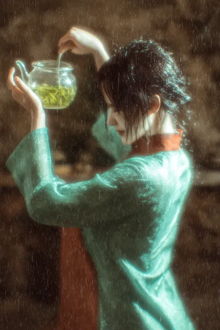 A young, beautiful woman from the East raises a teapot leisurely. With a slight pressure of her wrist, a column of water cascades down, rolling and tumbling like snowflakes hitting the cup's wall, producing a soft sound. The tea leaves, colored like tender bamboo shoots, are a light green and turn like swimming fish in boiling water. The water gradually takes on a green hue, with a faint fragrance rising up as the thickness and height of the water column change in an orderly manner. The works mainly feature long, low melodies, excelling at capturing natural light, with a strong contrast between light and shadow. Often, one side of a person's face is illuminated by light while the other is in shadow, or the main subject is in sunlight with the background in shadow. The image has a strong contrast between light and dark, highlighting facial contours, rich in detail, with clear layers that shape the character's three-dimensionality and add depth to the image. The composition features diagonal lines, with vibrant color styles that include cool and warm contrasts; warm tones with high saturation and medium-high brightness, and cool tones with medium-low saturation and brightness. The image presents an impressionistic oil painting texture, conveying laziness and warmth. Using a film style to freeze moments of daily life, the scene combines elegance with the leisure of French countryside aesthetics, creating a warm and serene atmosphere. Film texture: 35mm film grain, Kodak Vision3 500T aesthetic, aspect ratio: all shots must be in 16:9 cinematic widescreen (mandatory). Skin texture: hyperrealistic- visible pores, wrinkles, natural blemishes * zero retouching flaws * zero retouching, realistic human texture * skin texture more lifelike, just like a real person. Lighting: * natural light preferred * real shadows * ambient light fully affects skin tone. Motion blur: moving shots must have shutter blur effect, maintaining the same location as the original image: the same street, bridge, room, studio, beach, or architectural structure. It cannot be replaced by an entirely different place. Due to changes in camera angle, new environmental areas are allowed and expected. When new perspectives appear, they should reasonably extend based on the original environment (same buildings, railings, road markings, wall surfaces, colors, materials, lighting styles, etc.), as if the camera is moving in the same location. Close-up body parts (1-2, sometimes 3): Each editing selection should include 1-2 main body parts close to the lens (more complex poses can reach 3). Each image must vary without repeating the same part. Parts that can be brought close to the lens include: one or both hands/fingers reaching towards the lens; one or both feet/shoes/boots in front of the lens; knees or thighs; face very close to the lens; shoulders or upper body close to the lens due to a shrug or forward-leaning posture. These parts must be very close to the lens, nearly touching it, allowing for visibility of skin texture, fabric texture, and real wide-angle distortion. Poses and overall body (complex and diverse): Create strong, cool, dynamic poses suitable for extreme angles. Randomly use different types of poses, including: standing with hands or feet reaching towards the lens; squatting or half-squatting close to the ground; sitting on the ground or an object; lying on the ground with legs or feet towards the lens; leaning forward intensely; twisting the body, crossing legs, arching the back, etc., with dynamic lines. Complex poses may occur, such as: both hands close to the lens making gestures (peace sign, triangle, compositional frame, pointing at the audience); both feet facing the lens; one hand and one foot simultaneously enlarged in the foreground; face close to the lens while also having hands or feet in the perspective range. Maintain reasonable human anatomy even under extreme perspective. The face must belong to one person. --ar 2:3 --v 7 --style raw --weird 45 --stylize 100