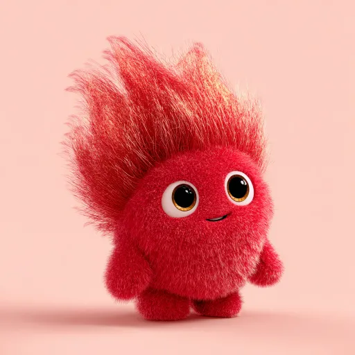 A cute red long-haired plush round character, overall in an irregular oval shape, with long, soft, fluffy hair, and a head that resembles a flame cloud swaying in the wind. The head is large and the body is small, with a plump body. The expression is full of energy, with bright, shiny eyes. The texture is long plush fur, overall soft and realistic, with distinct layers of fluff and slightly glimmering tips. C4D high-quality rendering, with soft lighting creating warm highlights. The background is a light pink solid color, clean and simple, highlighting the subject. --ar 1:1 --v 7 --stylize 100