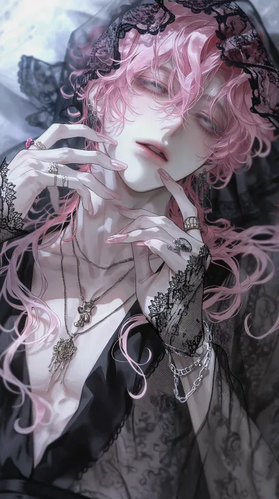Semi realistic style, anime, matte texture, hazy feeling, handsome adult man, soft, pink hair, long hair, slightly curly hair, white eyes, white skin, white eyelashes, drooping eyes, blurred background, sense of atmosphere, gothic style gauze clothes, necklaces, open neckline, gauze clothes, high recognition rate, high definition, high picture quality, lace headdress, bracelet, rings, hands up to touch the face, stockings, full body photos, lying back --ar 9:16 --niji 7