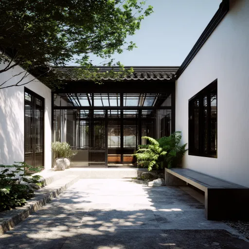 Modern Chinese style courtyard, with north and south rooms, and a glass sunroom connected to a basement with skylights on the west side. The courtyard door opens west, and there are shadow walls inside. The architectural rendering is photo realistic and sunny. one Original layout: The courtyard is 14 meters long from north to south and 10 meters wide from east to west. The main room (north room) faces south and is located on the northernmost side. The east master bedroom is 3 meters east to west and 5 meters north to south. The west guest bedroom is 3 meters east to west and 5 meters north to south. The middle living room is 4 meters east to west and 5 meters north to south. There is a 1.2-meter-long bathroom on the north side of the living room. The main entrance is in the living room, with three rooms connected. 2. The south room faces south and north, 6 meters away from the main room. It is 4 meters long from north to south and 10 meters long from east to west. On the west side of the south room, there is a washroom that is 1.2 meters wide from east to west and 5 meters long from north to south. The washroom is separated by dry and wet areas, with a shower on the south side and a toilet in the middle. On the north side, there is a washbasin and washing machine. The washroom is connected to the guest bedroom, yard, and basement (the doors to the guest bedroom and yard open from east to west, and the northernmost part leads directly to the basement). Guest bedroom: 4 meters long from north to south and 3 meters long from east to west. The easternmost part of the south room is the kitchen, which is 4 meters long from north to south and 5.8 meters wide from east to west. There is a hutong outside the south wall of the south room, with high windows on the south side for natural lighting, and electric skylights on the roofs of each room for natural lighting. Between the south and north rooms is the central courtyard. On the east side of the yard is the neighbor, and the layout of the house and yard is the same. On the west side is a quiet path and the wall of the neighboring community, located 10 meters away. four Add basement: used for storing miscellaneous items and things. Located on the west side of the courtyard, 0.5 meters away from the courtyard wall. The size is 2 meters from east to west and 3 meters from north to south. Above it is designed an openable electric glass skylight 40cm above the ground, which is 2 meters long from north to south and 1 meter wide from east to west, used for lighting, ventilation, and plant growth. five The entrance to the basement is located on the inner north wall of the westernmost room in the south room. Going down the stairs, the connection between the stairs and the courtyard is designed as a glass room and connected to the basement skylight, unaffected by weather conditions. --ar 1:1 --v 7 --stylize 100