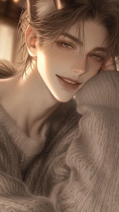 https://images.gogpt.vip/aigf/m_origin/20260126/2040033/in54mdf6wy96a46q.jpg Gentle, mature, and handsome husband-like male, around 28 years old, with soft facial features, smiling eyes and a gentle gaze, neatly styled brown wolf tail short hair half tied up, temperament is mild and steady, skin texture is natural; the face is illuminated by soft warm light, dressed in casual gentle style clothing (loose knit sweater), posture is relaxed and stretched, background is a cozy everyday home scene; semi-realistic painting style, skin details are exquisite, overall picture has warm color tones. --ar 9:16 --c 5 --stylize 100 --iw 0.25 --niji 7 --sref https://images.gogpt.vip/aigf/m_origin/20260126/2040033/in54mdf6wy96a46q.jpg --sw 23