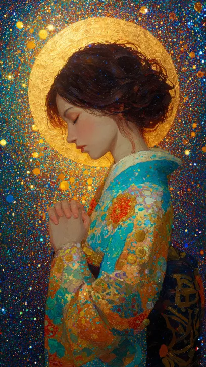 A young woman with closed eyes praying, in profile, her expression calm and serene, hands clasped together, wearing a colorful kimono adorned with intricate patterns, in the style of Klimt, surrounded by a radiant golden halo, backdrop of a cosmic whirlpool filled with starry skies and colorful light dots, pointillism technique, rich texture, glowing particles, ethereal and sacred atmosphere, warm color tones dominated by gold, turquoise, and deep blue, dreamlike quality, healing vibes. --ar 9:16 --v 7 --stylize 100