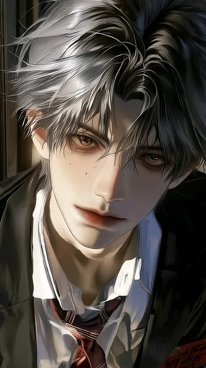 Anime pseudo thick painting style, adult male, extremely exquisite side view, scarlet transparent eyes like being immersed in the dark night, the tail of the eyes slightly hanging with an inextricable sense of melancholy, slender eyelashes with clear roots, and tiny shadows when blinking. The contour of the high and sharp nose bridge is sharp, with a natural curvature at the tip of the nose, and delicate shadows on both sides of the nose. The thin lips lightly hold an unlit cigarette, and the cigarette body is slanted against the corner of the lips. The filter is light beige, forming a soft contrast with the lip color. White long hair is soft, fluffy, and shiny, with distinct layers of hair. It is tied into a thin ponytail and the hair rope is hidden between the hair without being abrupt. The tail of the hair naturally falls onto the shoulder blades, and a few strands of broken hair move gently with breathing. They are attached to the jawline, neck, and behind the ears, and the texture and direction of each hair strand are clearly visible. Wearing a loose white cotton shirt on the upper body, the fabric is soft with a subtle texture, and the collar is slightly open, revealing a slender and distinct collarbone. The collarbone depression is faint, and the fabric naturally hangs down to form soft folds. The shoulder line is smooth and neat, and the cuffs are slightly loose but not tight, fitting the curves of the arms without feeling cramped. The cold white leather has a delicate and transparent texture, exuding a healthy thin red color. The facial light and shadow layers are rich, with only a faint side light gently sweeping the contours from diagonally above, forming a transition between light and dark at the brow bone, cheekbone, and jawline. The background is a dark dark space with a hazy and blurry appearance, without any clutter, as if wrapped in a thick night sky. There is no unnecessary light source interference, and only a very faint soft light is diffused at the edges of the character outline to avoid a dull picture. The overall contrast of brightness and darkness in the picture is natural and high-end, with clean and delicate lines without clutter, low and soft color saturation, 8K ultra high definition resolution, and light and not heavy brush strokes. It retains the anime texture while making skin texture, hair luster, clothing wrinkles and other details real and touchable. The proportion of people and objects is harmonious, and the atmosphere is lonely and lazy, with a sense of alienation and fragmentation. --ar 1:2 --stylize 100 --niji 7 --sref https://images.gogpt.vip/aigf/m_origin/20260121/2034513/gvtmwz3x0jzafmud.jpg