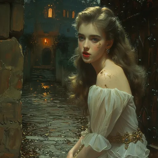 This is a gloomy and sorrowful oil painting depicting the scene of Princess Eliza being expelled from the castle gate. She disguised herself as a beggar, her face covered in walnut juice, her hair disheveled with grease, and her clothes ragged. She gazed at the magnificent castle with teary eyes, a mixture of fear and despair. She was abandoned by her father, the king. The scene is shrouded in a cold and damp atmosphere, with muddy paths leading to the dark forest. Thick oil paint layers are stacked, with rough and clear strokes that are visible. The scraper technique is used, with brown, gray, and dark green as the main colors, creating a gloomy atmosphere. The style of this painting is similar to the works of Francisco Goya and Honor é Dumi é e, depicting the suffering and struggle of the princess, making it a masterpiece. --zoom 2 --ar 1:1 --v 6.0 --style raw --stylize 300 --sref https://images.gogpt.vip/aigf/m_origin/20260217/1855713/v1f6y010z43078mq.jpg https://images.gogpt.vip/aigf/m_origin/20260217/1855713/ufed3sj7td1cul0z.jpg https://images.gogpt.vip/aigf/m_origin/20260217/1855713/eflhaqdg09xjpbvi.png --cref https://images.gogpt.vip/aigf/m_origin/20260218/1855713/uf8joctq2njlk868.jpg https://images.gogpt.vip/aigf/m_origin/20260218/1855713/z07yay6e98uawyrr.jpg https://images.gogpt.vip/aigf/m_origin/20260217/1855713/xunclpagiy3pc0bb.jpg --cw 100 --sw 300 --sv 1