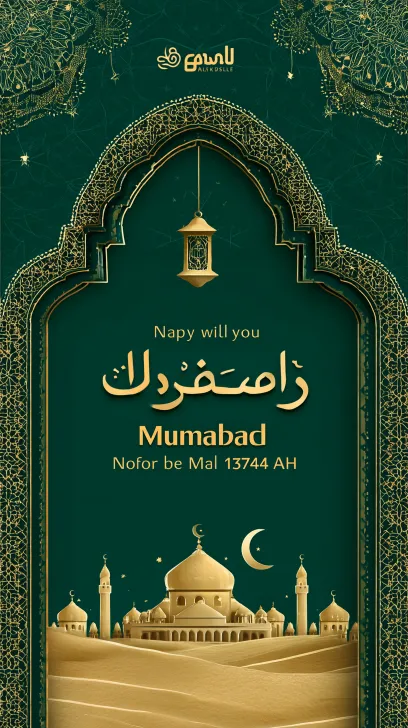 https://images.gogpt.vip/aigf/m_origin/20260219/2059866/cap72q39h4pp42d7.jfif Generate a corporate style Ramadan blessing poster. Theme text: Ramadan Mubarak 1447 AH deep grandmother green background, decorated with golden lines. Islamic arched frame structure, with a symmetrical overall composition. Reserve a brand logo position at the top. The visual elements include: crescent moon, golden chandelier, silhouette of mosque, and distant sand dunes. Arabic geometric pattern border, golden relief texture. The overall style is high-end, restrained, and international. Corporate holiday greetings visual, without any commercial promotional feel. Concise layout with large areas of white space. No cartoons, no photo styles, no complex patterns. High definition, professional poster design style. --ar 9:16 --v 7 --stylize 100