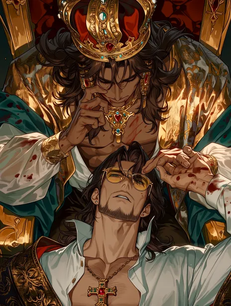 Generate Novel Cover Title: I Am Leveling Up by Fighting Monsters Inside the Game Genre: Two Male Leads Style: Modular Keywords Main Subject: powerful dark-skinned male sultan, long wavy dark brown hair, bloodstains and wounds, muscular physique Main Subject 1: CG illustration from a top-down perspective of Male Lead 1. The exotic king leans down from above, his wide sleeves drooping, long hair sweeping across the edge of the frame, with a captivating and focused expression. Below is the AI engineer lying on his back, gold-rimmed glasses sliding down to his nose, his gaze a mix of shock and determination, work uniform collar open, revealing his neck. The king's finger is about to touch the engineer's forehead. Main Subject: Male Lead 1 is a powerful young man with deep brown long curly hair and muscular lines. Male Lead 2 is a cool and resolute man, medium-length hair, dressed elegantly, a modern intellectual. Apparel and Accessories: Luxurious crown embedded with gems, large gold earrings with red gems, gold necklace with a cross emblem and ruby, luxurious silk robe with Persian/Ottoman patterns. Scene: A magnificent golden throne in a dark and luxurious court. Art Style: Baroque style digital painting, heavy brushstrokes, strong light-dark contrast, dark fantasy aesthetic. Color Palette: Gold, deep red, rich teal, ivory. Atmosphere: Cold sense of power, decadent luxury, bloody royalty. Composition: Dynamic seated pose, cinematic composition, vertical format. --ar 3:4 --stylize 100 --niji 7