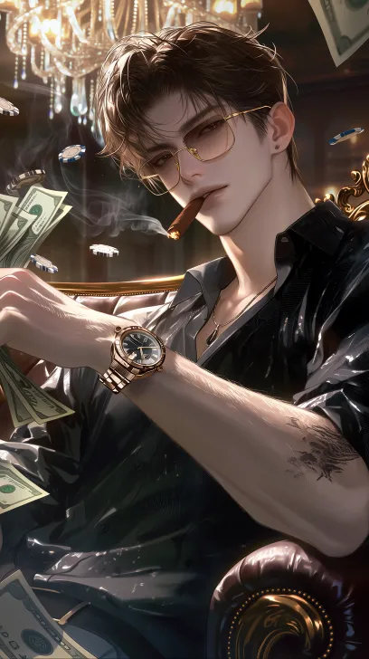 Screen effects: 8K quality, master-level composition, cinematic-level lighting and shadow effects, artistic beauty in the image, highlighting the character's emotions and environmental atmosphere, photo-level realism, realistic skin texture, hyper-realism, symmetrical portrait, clear facial features, translucent and plump skin, delicate brushwork, prominently depicting hair strands and eye highlights, perfect hand shape, highly saturated colors, high contrast, blurred background. Character description: a handsome man (mature feel, clean-shaven), stunning facial features, deep brown eyes with a gradient shine (cold, contemptuous, and charming gaze). Brown short hair (messy, distinct strands), clearly defined and smooth muscle lines. Healthy warm white skin tone, wearing a black shirt (loose, with dark patterns), sleeves rolled up to the elbows, with a black tattoo on his arm, wearing a mechanical watch on his wrist (high-end feel, metallic strap), and sporting gold thin-framed glasses on his face. Scene action: casino, character sitting on a sofa, leather texture of the sofa (with wood grain edging), behind him is a luxurious chandelier, holding a lit cigar in his mouth, tossing a stack of dollar bills into the air (the dollar bills have a paper texture, soft), with scattered chips around, looking at the camera. Ambient light: dim, indoor, oppressive feel, serious feel, dark and hazy atmosphere, backlit, face in shadow. --ar 9:16 --stylize 100 --niji 7
