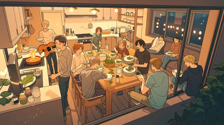 **Overall scene: * * Warm and spacious open living room kitchen, in the evening, twelve friends are gathering. A wide-angle lens with a slight overhead view, allowing the entire spatial layout to be seen. From left to right on the screen are the kitchen area, dining table area, and living room area, with a bay window in the front right. The light is warm and soft, with the sunset outside and warm colored lights indoors. **Character grouping and actions (four groups in total, with three people in each group): * * * First group: Kitchen cooking group (left rear of the picture) * *- Character 1 (Chef): Standing in front of the stove, shaking the spoon, as if flames were rising from the pot, with a focused and confident expression- Character 2 (Vegetable cutting assistant): Cutting scallions on the cooking table, but attracted by the shaking spoon, turning his head to look at the Chef, with the knife hanging in mid air, with a stunning expression- Character 3 (Seasoning artist): Scooping soup from the pot with a spoon, tasting the taste, holding a salt jar with the other hand, frowning slightly, carefully judging the saltiness * * Second group: Table setting group (center of the picture) * *- Character 4 (Plate setting group) Artist: Bending down and carefully placing mint leaves on the dessert with tweezers, with an extremely focused expression- Character 5 (Dish Dispenser): Holding a stack of bowls, placing them one by one in their respective positions, Counting with words in his mouth- Character 6 (deliveryman): Just brought hot dishes from the kitchen, slightly leaning to avoid the heat, carefully placing the dishes on the table, staring at the plate * * Group 3: Living room chat group (sofa area on the right side of the picture) Look at yourself and quickly hold back a smile. Group 4: Drift Window Quiet Group (front right of the screen). Character 10 (Guitar Singer): Sitting on the bay window, holding a wooden guitar, gently plucking the strings, Playing a soothing tune- Person 11 (listener): Sitting on the other side of the bay window, knees curled up, hands resting on cheeks, quietly listening to the guitar, with a satisfied smile on his face- Person 12 (cat lover): Sitting on the cushion of the bay window, holding a cat in his arms, gently stroking the cat's back, his gaze falling on the guitarist * * Scene details: * *- There is open red wine and vegetable leaves on the kitchen countertop that haven't been tidied up yet- There are several dishes on the dining table, some are steaming slightly, some have already eaten halfway- There are melon seeds, potato chips, and a few half drunk cups on the coffee table in the living room- Several colored cushions are placed on the bay window There is a pot of green plants on the windowsill, and the sunset pours in through the curtains. Atmosphere and style: The whole picture is warm and lively, but there is also a corner of the bay window that creates a peaceful contrast. The light is soft and the color tone is warm. Adopting illustration style or digital painting, rich details, vivid colors, and shallow depth of field effect make the four groups of characters more prominent. The picture is full of life atmosphere, like a real and warm moment of friends gathering. --ar 16:9 --stylize 100 --niji 7