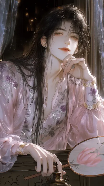 (Thick Coating: 1.5), (Pseudo Thick Coating), (Semi Realistic), (2.5D Rendering), (Delicate Cold White Skin), (Movie Grade Light and Shadow), Warm Tone, Soft, (Clear Black Long Straight Hair) A male courtesan of about 25 years old, leaning against a carved wooden window with thin gauze curtains, with a lazy and seductive posture. His long black straight hair cascades down like a waterfall, with some hanging down from his chest and others draped over his shoulders. The strands of hair are distinct and smooth like satin. He was wearing layers of pink chiffon on his body- the innermost layer was a light pink silk undershirt, with slightly open collars, revealing clear collarbones and a small piece of chest; The middle layer is a semi transparent cherry blossom pink gauze, embroidered with faintly visible silver threads and dark peony patterns; The outermost layer is a wider lotus colored chiffon blouse, with long sleeves hanging down and cuffs adorned with light golden rolled edges. The texture of the gauze garment is light, thin, and soft, flowing with his subtle movements, and the skin is faintly visible after layers of pink gauze. He lazily propped up his chin with one hand, his fingers long and fair, and between his fingers was a round fan with a rosewood handle. The fan surface was made of plain white silk, with a pale pink hanging crabapple painted on it. The other hand naturally hung down on the windowsill, and the fingertips lightly touched a small bronze incense burner. His face was exquisitely delicate, almost indistinguishable between male and female. His eyebrows were slender and slightly raised, with a touch of light red rouge at the end of his eyes. His pupils were light amber, and his gaze was hazy and watery. He looked out the window (or towards the camera) with a smile that was neither a smile nor a smile. His hair was fluffy and thick, and his lips were a low saturation bean paste red, with a slight curve that seemed elusive. The background is by the window of the ancient style flower tower, with dim lights in the night outside. The shadow of the window sill falls on him, and the entire picture is filled with an ambiguous fragrance. --ar 9:16 --stylize 600 --niji 7