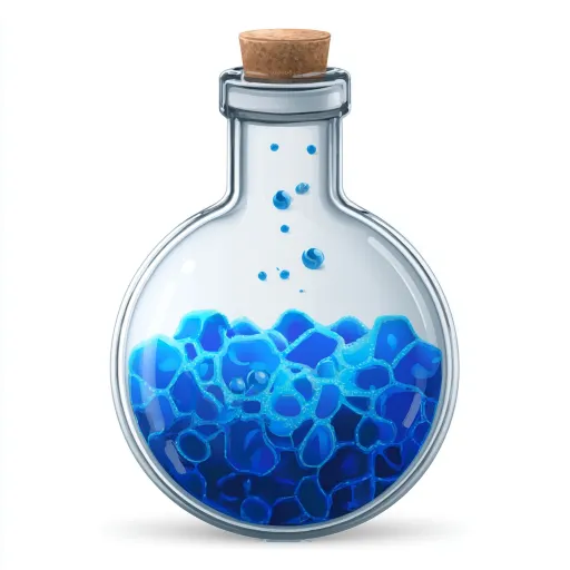 Please generate a vector diagram of a circular glass beaker for laboratory use, with a bottle cap and irregular blue solid particles inside. The beaker has a circular body and the style is based on the reference image --ar 1:1 --v 7 --stylize 100 --oref https://images.gogpt.vip/aigf/m_origin/20260221/1879204/gsag6dsidc8uz5p1.png --ow 400