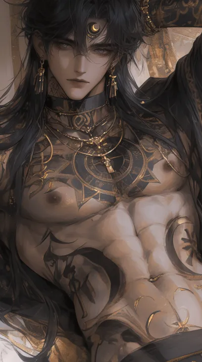 2.5D Anime Illustration Thick Paint Style Medium Scene A Handsome Man Black Skin Gold Vertical Eyes Long Curled Black Hair "M" Word bangs (delicate hair, slightly curled hairstyle, feeling the sensation of the waist) with gold (inlaid gold feeling) on the body (chest, arms, neck), tattoos (with exquisite gilded holy patterns surrounding the Xi Ri totem), bilateral Xi Tian Yu Jin wheel earrings (the wheel is as big as the palm of the hand) with matte Xi Jin multi strand neck chain pendant on the neck, hollowed out Xi Tian Yu Jin wheel totem circle brand, left wrist strap with a sun sun gold pattern bracelet, left arm with a Yu Jin Xi wheel arm ring, matte Xi Jin material, facial features, highly aggressive jawline, sharp like a knife cutting high, straight nose bridge, thin lips occasionally evoke a dangerous smile, fluffy and dense hair, inverted triangle figure man looking at the camera, left hand supporting chin With a hint of danger, the man is very handsome and handsome (set in ancient Egypt) The fluorescent lamp requires the man to be located in the middle of the frame, from the man's head to the crotch (the frame should show the man's head, neck, chest, and crotch). The golden tattoo gives a feeling of gold inlay, and the man is very mature, rough, and has a well-defined facial structure --ar 9:16 --style raw --stylize 288 --niji 6 --profile odk9fo3