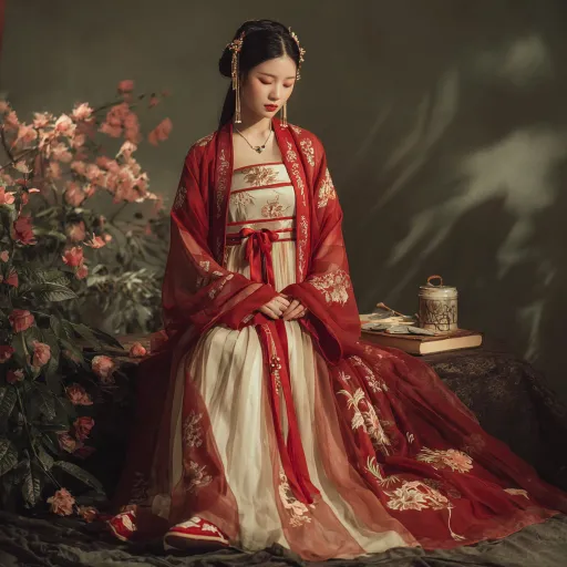 Dressed in a red and gold themed Hanfu, the outer layer is a gradient red sheer garment with exquisite embroidered patterns, while the inner layer is a cream-colored slip. The golden patterns at the cuffs and hem of the skirt are very delicate. A red waist ribbon with tassels is tied around the waist, and on her feet are small red embroidered shoes, creating an overall festive yet elegant color scheme. Scene atmosphere: The figure is placed on a textured dark-colored base, with a blurred background of green plants and pink flower branches, creating an elegant atmosphere reminiscent of a spring garden. Next to it is a small tea canister and books, adding a touch of life, and the entire scene is filled with traditional Chinese aesthetic and a sense of healing. --ar 1:1 --v 7 --stylize 100