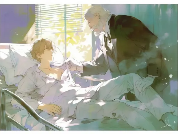 In the sunny ward, a blond and pale young man lay on the ground, staring directly at the camera wearing a white gown and pants, revealing his delicate neck and rugged shoulder blades. Standing beside the hospital bed was a chubby white man in a suit, grabbing the boy's collar with his hand and looking fierce. The boy's face was full of resistance and struggle. The scene is infused with Edward Hopper's style of loneliness aesthetics, and Octane rendering technology presents dramatic beams penetrating through blinds. Ultra high definition details capture the folds of linen sheets and floating dust spots, interweaving cold and warm light and shadow weaving to suppress a silent atmosphere --ar 4:3 --stylize 100 --niji 7 --sref https://images.gogpt.vip/aigf/m_origin/20260209/1683993/g9r8eelwn0pxt9zu.jpg --sw 94