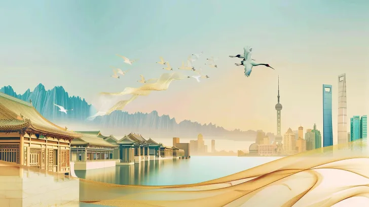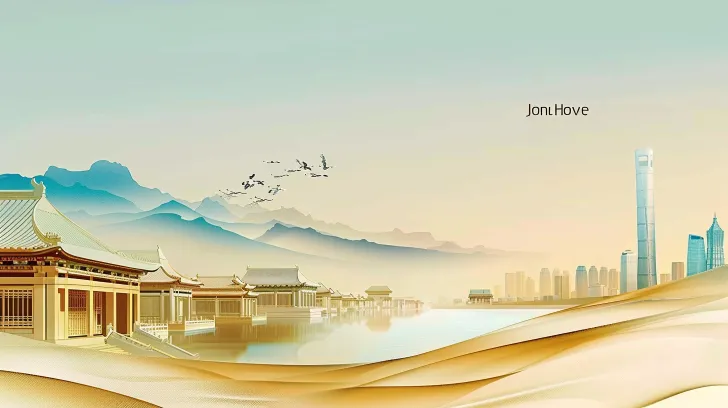https://images.gogpt.vip/aigf/m_origin/20260221/2060906/7ha5sjkfiiu7pre1.jpg https://images.gogpt.vip/aigf/m_origin/20260221/2060906/3d1ckhca8yef9zto.jpg A stunning digital illustration that combines traditional Chinese ink landscape painting with modern urban skyline. The overall color tone is blue-green, with Beijing's characteristic buildings on the left. The flowing golden light winds through the edges of the buildings like silk. In the distance, hazy blue mountains and tranquil lake water reflect the scenery. A group of cranes fly in the light blue sky. On the right side of the picture is a skyscraper in a modern metropolis, with harmonious contrast between ancient and modern elements. Soft and elegant gold, beige, light blue, and white tones, smooth lines, cinematic composition, 8K, super detail, John Howe, vanishing point composition, --ar 16:9 --v 6.0 --style raw --stylize 100 --iw 0.3 --sref https://images.gogpt.vip/aigf/m_origin/20260221/2060906/3d1ckhca8yef9zto.jpg https://images.gogpt.vip/aigf/m_origin/20260221/2060906/7ha5sjkfiiu7pre1.jpg --cref https://images.gogpt.vip/aigf/m_origin/20260221/2060906/7ha5sjkfiiu7pre1.jpg --cw 32 --sw 236 --no Character