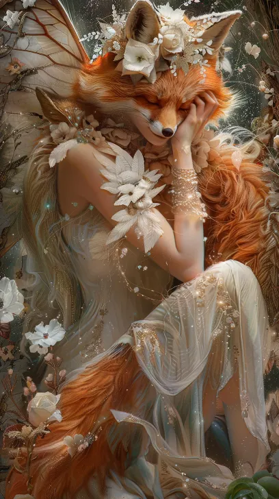 A person's body fox fairy has a very charming and fantastical background. --ar 9:16 --v 6.0 --stylize 100