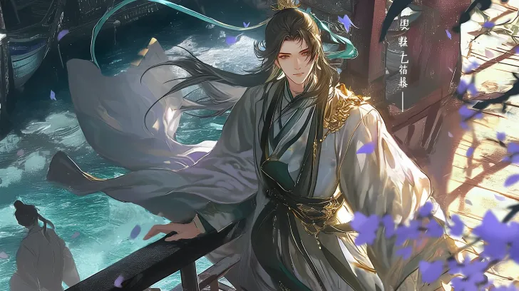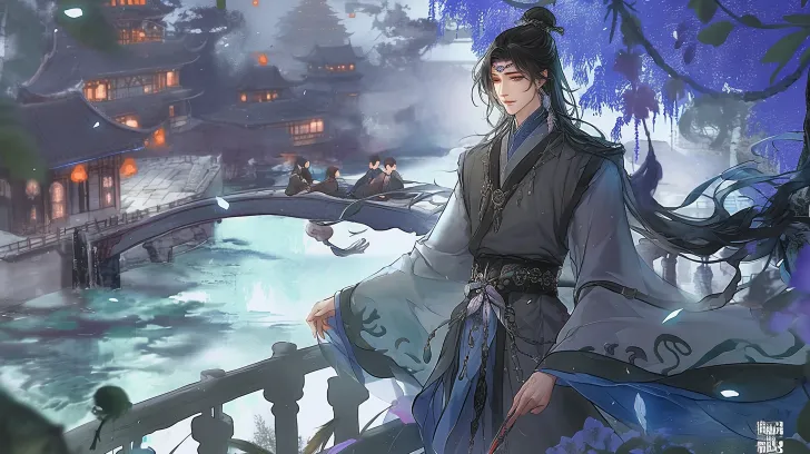 https://images.gogpt.vip/aigf/m_origin/20260221/1131737/6c64t1u72n02inwf.png https://images.gogpt.vip/aigf/m_origin/20260221/1131737/67qxuerriej1n5ti.jpg https://images.gogpt.vip/aigf/m_origin/20260221/1131737/235oh9znwlsal6j0.jpg 8K ultimate ultra clear picture quality, global anti aliasing fully open, high detail texture fully stretched; Anime style, ultimate thick coating technique creates a transparent glass texture, streamlined brushes outline smooth lines, the picture has a natural granular feel, and full range soft light processing; Core subject: Anime ancient style male, with ink colored long hair tied up and messy and casual, long hair flying, cold white transparent skin, phoenix eyes, and a gentle temperament interwoven with expressions, full of emotional tension; Clothing details: Wearing Hanfu in white and green color scheme, the yarn is light, silk is smooth, velvet is soft and sticky, and pearl yarn is lustrous. The multiple materials are spliced in distinct layers, and the long robe is decorated with complex natural folds and exquisite gold chains, delicate and exquisite, with a sense of luxury and texture; Composition perspective: overhead view, full body composition, focusing on the character's demeanor, hair condition, and clothing details; Atmosphere color tone: Unified night color tone, blue color tone at night, ancient buildings in the distance, bright lights, boys walking on the bridge, gentle laughter, water waves under the bridge slightly rippling, gentle movements of clothes fluttering in the wind, top-down composition, background with ancient pedestrians walking across the bridge, flying clothes and hair, the overall picture is dreamy and hazy, light and shadow transitions are soft, details are delicately depicted without blurring, glass texture and clothing texture are clear and visible, matching the style tone --ar 16:9 --stylize 100 --iw 2 --niji 6