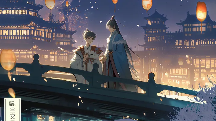https://images.gogpt.vip/aigf/m_origin/20260222/1131737/8k39ki8ubjxmr8tw.png https://images.gogpt.vip/aigf/m_origin/20260222/1131737/68ttvwrikcwmpurd.jpg https://images.gogpt.vip/aigf/m_origin/20260222/1131737/d55g30wpbi5a6rpj.jpg https://images.gogpt.vip/aigf/m_origin/20260222/1131737/9gxboicp005hgmy5.png Ancient style illustration, horizontal composition, head up view, at night, a handsome Hanfu boy walks on a bridge, with pedestrians holding lanterns passing by in the background. The lights are bright, and there are ancient pedestrians walking by in the background. The fluttering clothes and hair create a dreamy and hazy overall picture, with soft transitions of light and shadow, exquisite details without blurring, and clear and visible glass texture and clothing texture that match the style tone --ar 16:9 --stylize 100 --iw 2 --niji 6