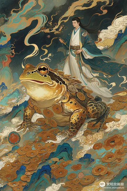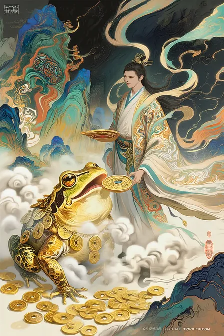 https://images.gogpt.vip/aigf/m_origin/20260221/2061252/p8jabecb26uiqjfl.png https://images.gogpt.vip/aigf/m_origin/20260221/2061252/g40cpz69ke46lgtv.jpg Reduce the proportion of the golden toad and enlarge the proportion of the characters as the main theme of the picture, refine the facial features of the characters to make them more delicate, with a traditional Chinese pattern background and Dunhuang art style. Epic images, outlined by liquefied gold. The color changed from dawn red pottery to noon molten copper, gradually transitioning to the sunset tone of sapphire. Incorporating elements of Chinese auspicious clouds, single point perspective, fisheye perspective, a mysterious figure dressed in gorgeous traditional costumes, holding a golden plate with a gold coin on it, standing in white clouds and mist. Behind him was a huge frog, covered in golden coins, appearing wealthy and mysterious. In the background, there are mountains and floating clouds, displaying brilliant colors and layers, and the overall atmosphere is full of dreamy and mythological colors. The picture features exquisite details and rich colors, reflecting a combination of elegance and mystery. Ultra high definition and ultra detail --ar 6:9 --v 7 --stylize 62 --iw 0.25 --sref https://images.gogpt.vip/aigf/m_origin/20260221/2061252/qzk8uq969azwpain.jpg https://images.gogpt.vip/aigf/m_origin/20260221/2061252/lzdubkfojrt2qld3.jpg --oref https://images.gogpt.vip/aigf/m_origin/20260221/2061252/g40cpz69ke46lgtv.jpg --ow 400