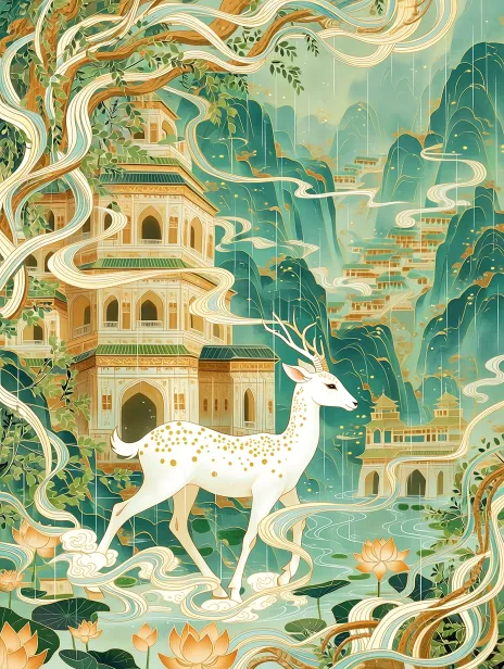 A delicate illustration that blends meticulous brushwork and ink painting. Amidst the Buddhist niches of Longmen Grottoes, a white deer lightly steps on clouds, its body adorned with golden dots of light. The ribbons and vines intertwine and dance, the Yi River ripples like silk, and the distant mountains hide in smoke and rain. The lines are exquisite and rhythmic, with elegant colors and green and ochre as the main tones, exuding a fairy like aura and Eastern charm. It is an artistic illustration in the style of deer and lotus --ar 3:4 --stylize 100 --niji 7