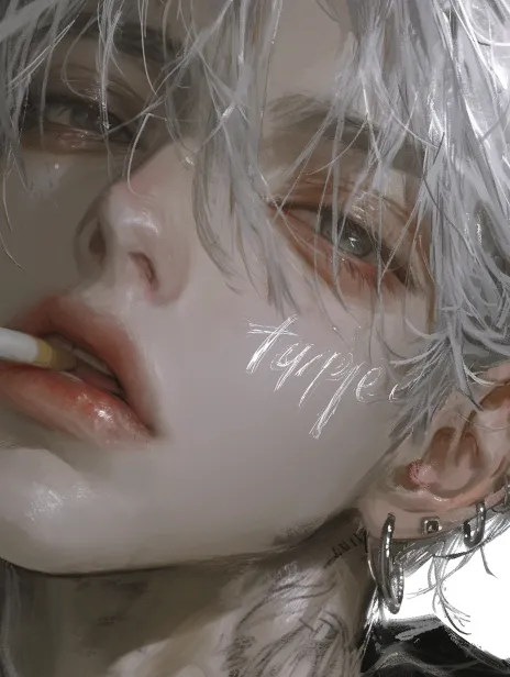 High-level CG thick painting illustration, OC rendering, oil painting, bizarre style, cool male, lazy feeling, world-weary expression, silver-white (light white) short hair, hair strands showing a fluffy, explosive texture, long bangs falling to one side, partially covering the face, overall styling is neat yet has a casual laziness, light hair color creates a strong visual contrast with black clothing. Decoratively, wearing small silver earrings (studs/small hoops) on the side of the ears, the style is simple, adding a delicate detail to the overall look without excessive complex decorations, fitting the casual style. In clothing, wearing a black printed short-sleeve T-shirt, the shirt features white English letter prints, densely and staggeredly arranged, adding a design sense to the pure black basic T-shirt; the cut looks relatively loose, creating a relaxed, nonchalant atmosphere. The character's action involves tilting their head up, lightly biting the body of the cigarette (the mouthpiece part), with the face turned towards the left side of the picture, only half of the face's outline visible, the posture appears lazy yet somewhat aloof, conveying a casual, laid-back temperament through the overall action. The item being bitten is a slim cigarette (the body is white, with red decorations on the mouthpiece), which is the most eye-catching object in the image, becoming a visual focal point of the styling. --ar 3:4 --style raw --stylize 250 --niji 6 --profile 8rfr9yc
