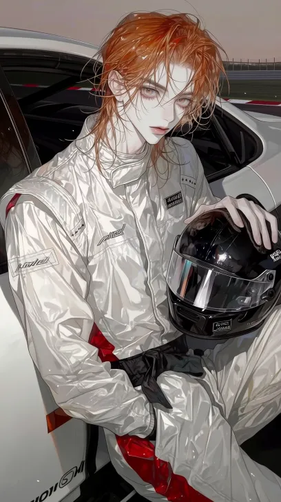 A man with medium-length orange hair, ash-gray peach blossom eyes, arched eyebrows, thick lips, light-colored lips, and wheat-colored skin is leaning against the side of a racing car in a white racing suit. He holds a helmet between his forearm and waist. The art style is flat, and the background is a racetrack. It is outdoor lighting, with soft light filtering through a few strands of hair. --ar 9:16 --stylize 100 --niji 7 --sref https://images.gogpt.vip/aigf/m_origin/20260222/2061623/gs7nlxdw1zltmyyy.jpg --sw 404 --no Trees,flowers,deformed fingers,twisted limbs,and distorted ornaments.