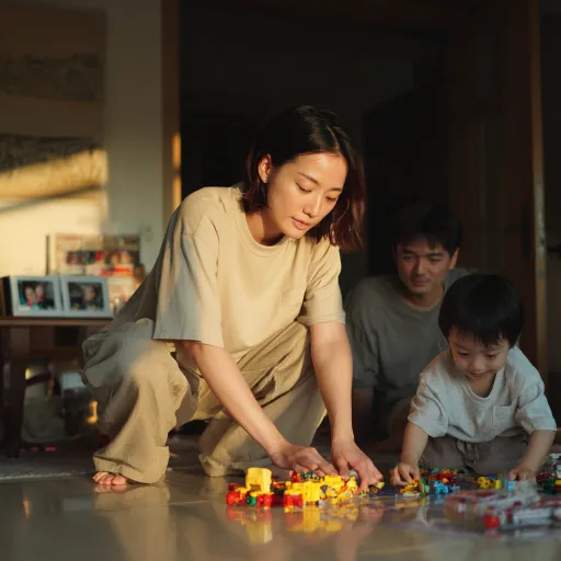 In the (MJ Rules+NIJI Series+Realistic Style) mid-range shot, Lin Wei (30 years old | short hair | wearing a simple T-shirt and home pants) crouches on the ground to tidy up toys, with the gentle sunlight shining on her profile and a soft expression. The background is a tidy living room with family photos placed on the table. My husband (35 years old | workwear | tired but gentle gaze) just walked in the door, and my child (5-year-old | children's clothing | innocent smile) rushed into his arms. The warm color tone and natural light and shadow highlight the harmonious atmosphere of the family. --ar 1:1 --v 7 --stylize 100
